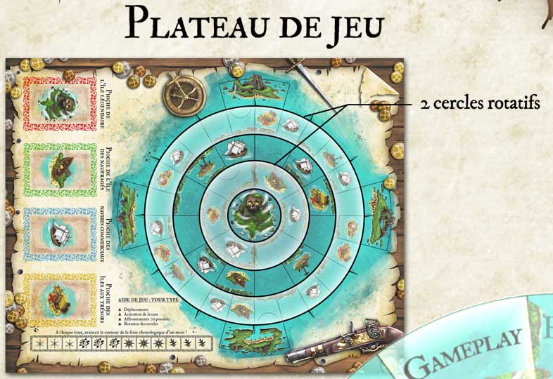 - plateau du jeu avec cercles rotatifs représentants les courants marins tourmentés de l'archipel