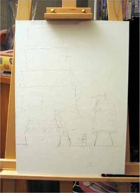 En toute logique, il aurait fallu commencer par peindre la mer et le ciel au complet, mais cela m'aurait empêché de faire l'ébauche au fusin.