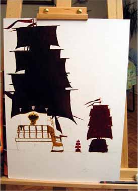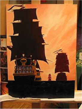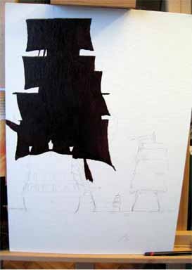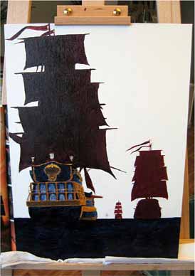 Après avoir terminé l'ébauche rapide des voiles des trois galions, j'ai commencé à peindre de manière succincte le navire du premier plan.