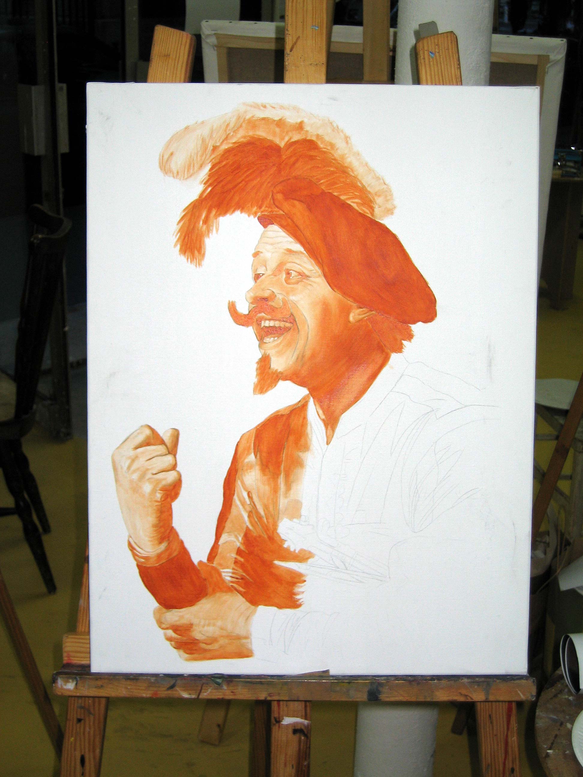 Commencement du camaïeu à l'aide de la couleur terre de sienne brûlée diluée à l'essence de térébenthine.