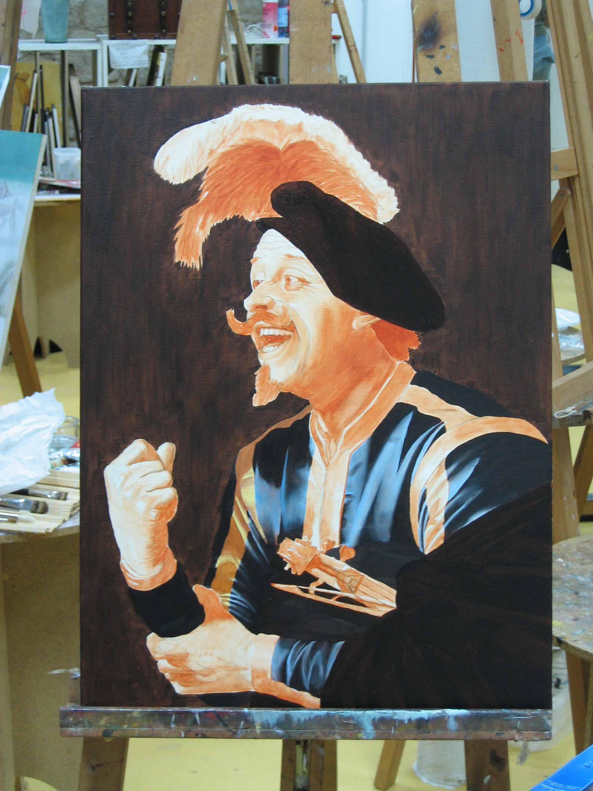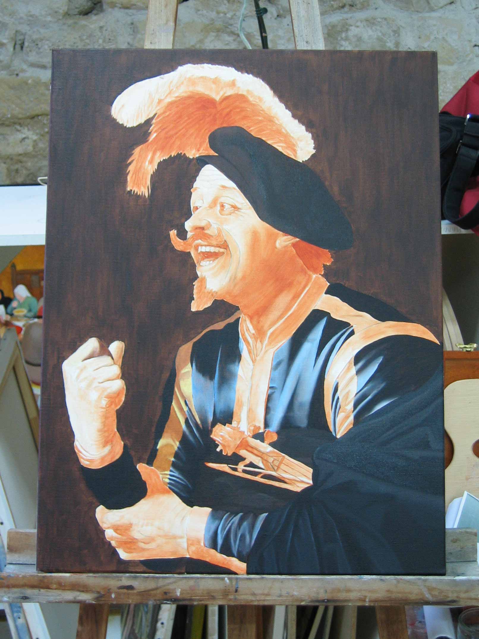 Travail en deux couches du visage. Il n'est pas fini, les dents sont trop blanches, la barbichette et la moustaches sont à peaufiner pour mieux voir les poils, les ombres et lumières du cou sont à faire.