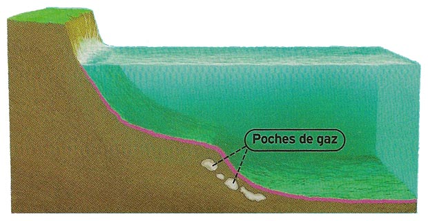 Le sol marin renferme des poches de gaz et notamment de méthane, provenant de la dégradation de végétaux et d'animaux morts.
