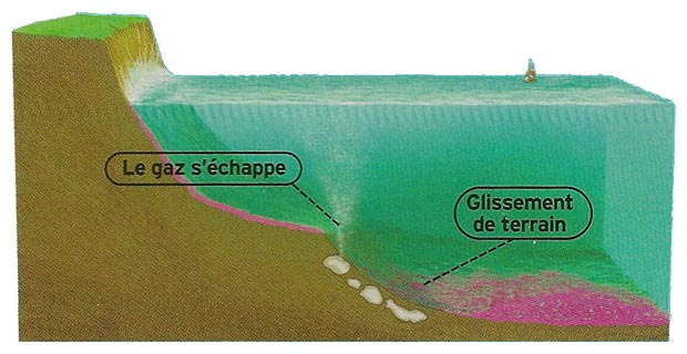 Un léger séisme ou des courants marins forts produisent un glissement de terrain, mettant à nu les poches de gaz.