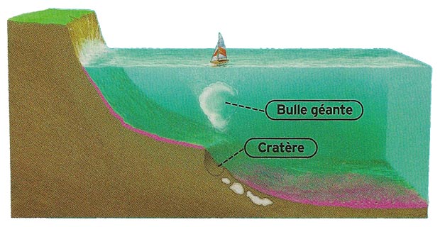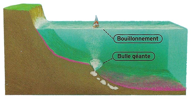 Le gaz s'échappe formant une bulle géante. Les marins peuvent apercevoir l'eau bouillonnante, qui sont les petites bulles échappées avant la géante. Le bateau se retrouve ballotté dans tous les sens. Il est trop tard pour fuir...
