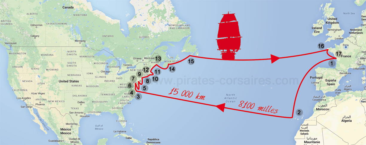 Le programme des escales de l'Hermione, un voyage de plus de 4 mois, soit 13 000 kilomètres ou 7 000 mille marin, du 18 avril au 29 août :1) 18 avril : l'arsenal de Rochefort