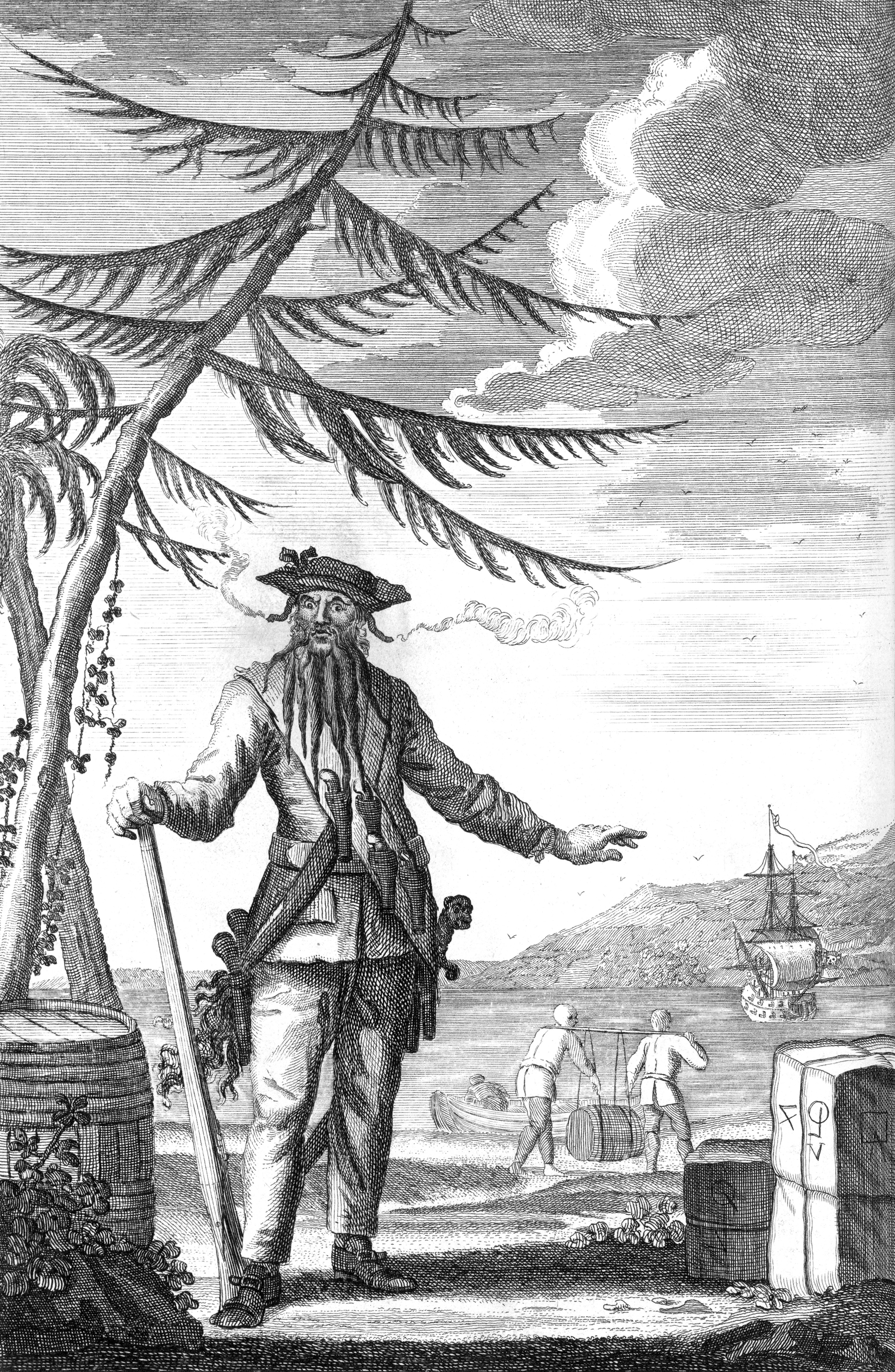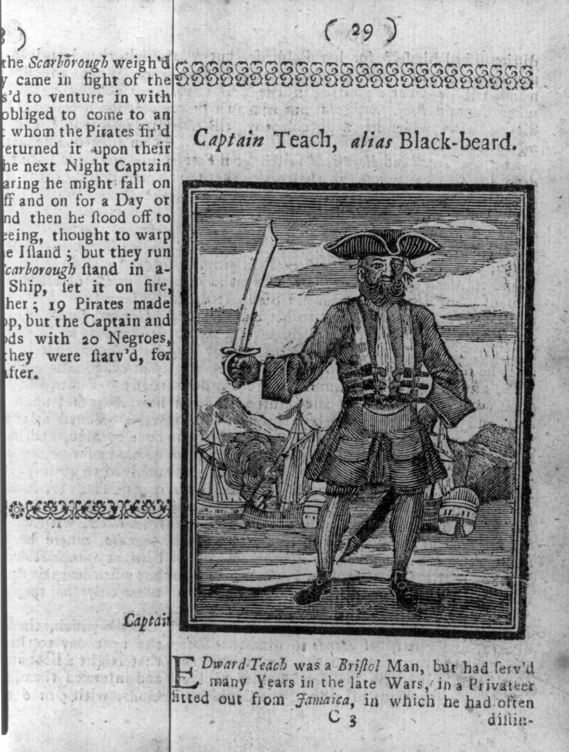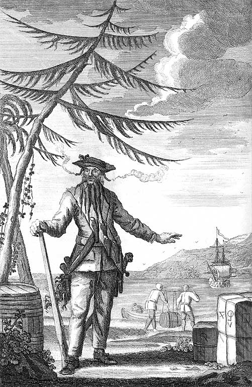 "Captain Teach, alias Blackbeard". Gravure datant de 1725. Ouvrage : The History and lives of all the most notorious pirates, and their crews. London, 1725.