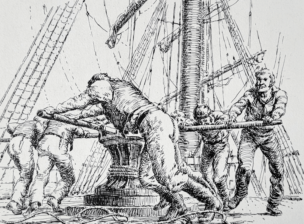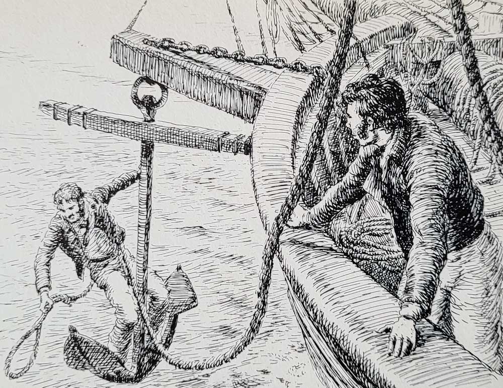 L'ancre contient une longueur de chaîne qui est fixée au tournevire. Le tournevire est le cordage qui s'enroule autour du cabestan.- Pendant que l'ancre se lève, les marins (appelés les gabiers) sont envoyés sur les vergues des basses voiles pour larguer les voiles.