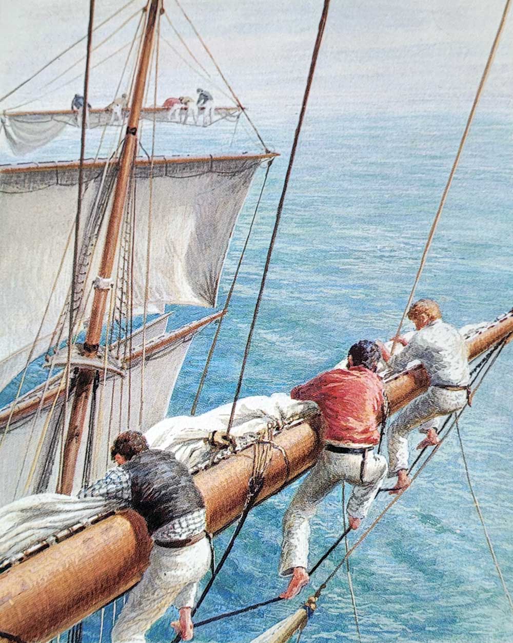 Les gabiers s'occupent ensuite de déferler les voiles hautes.- Le vent gonfle les voiles et le navire est prêt à appareiller.